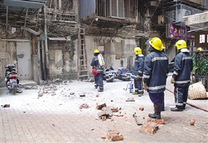 有商號以為金來大廈梯間電箱爆炸,立即報警求助。消防搶救車、水泵車和救護車接報到場調(diào)查,在現(xiàn)場拉起圍帶,封鎖懷疑爆炸的兩個地點一帶,避免行人走近。