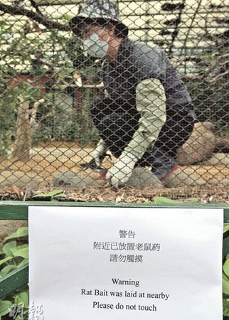 據(jù)悉,園內(nèi)9號(hào)鳥(niǎo)籠是鼠患重災(zāi)區(qū),內(nèi)里11種珍貴鳥(niǎo)類(lèi)常與鼠為伴,而靠近紅棉道的鳥(niǎo)籠則飼養(yǎng)了一批林鴛鴦,但日前草叢內(nèi)卻發(fā)現(xiàn)最少兩具鼠尸。康文署23日派員入籠清理,并在場(chǎng)內(nèi)除去雜草及噴灑消毒劑,又在園內(nèi)貼出告示,提示游客不要接觸已放置的鼠藥。