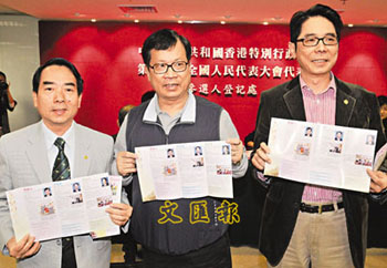 已取得56個提名的新界社團聯會理事長羅叔清,在已宣布不再角逐連任人代的李連生,與民建聯立法會議員張學明等人陪同下報名,其參選主要的政綱包括如何按照人大常委會的“決定”,并按基本法規定平穩發展香港的政制,如何加強國民教育,以致國家扶貧工作、食物安全與環保等方面的關注。他透露,新界社團聯會法律顧問簡松年正積極考慮以個人身份,參與港區人大代表選舉。