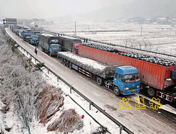 華中華南大雪封路,供港澳食品運(yùn)輸出現(xiàn)困難,不少運(yùn)豬和運(yùn)牛的車輛困在途中。圖為擠塞在京珠高速公路湖南段的車輛。(圖片來(lái)源:文匯報(bào))