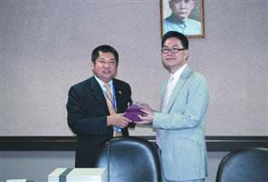 圖:黃新華向施清平(左)致送紀念品。(圖片來源:澳門日報)