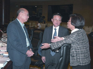 圖:曹其真、徐偉坤、鄭志強(qiáng)交換意見。(圖片來源:澳門日?qǐng)?bào))