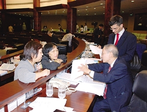 鄭志強與立法會顧問探討法案行文。(圖片來源:澳門日報)