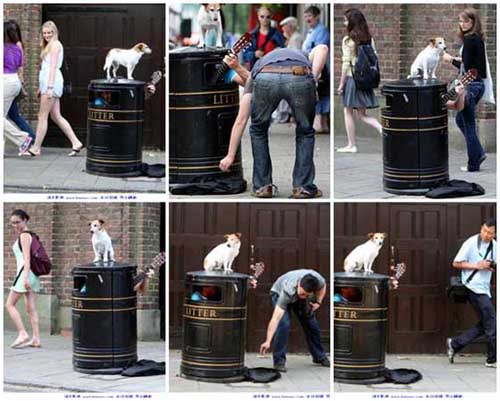 中新網(wǎng)7月8日電 據(jù)臺灣“今日新聞網(wǎng)”7日報道,英國一位知名的街頭藝人查理卡維(Charlie Cavey)總是躲在垃圾桶里自彈自唱。但這種表演方式行動不便,賞金時常被偷走或搶走,于是最近找來一只杰克羅素犬“歐比”(Obi)幫他把風(fēng)。歐比乖巧的模樣,令人聯(lián)想到在唱片上有超過100年歷史的知名LOGO。