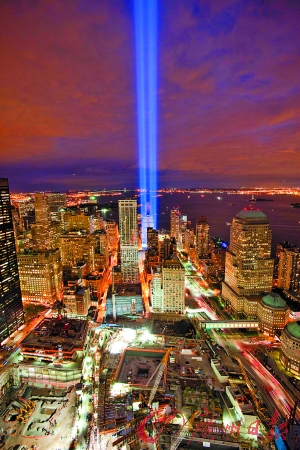 10日晚,紐約市用激光束“重現”世貿中心。