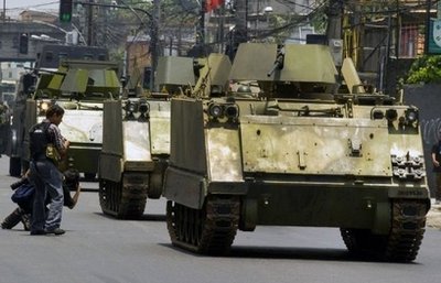 最少10輛配備點50口徑機關槍的“M113”裝甲車,隆隆駛過里約熱內盧市中心街頭,長驅直進開往該市北面的克魯賽羅貧民窟。當局從來未試過出動這種重裝備對付毒販,今次十足打仗一樣,許多居民都嚇了一跳。