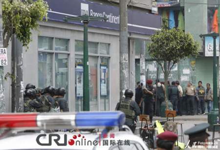 秘魯警方于當地時間3日晚在首都利馬采取突擊行動,擊斃一名搶劫銀行的持槍歹徒,成功解救了被扣押在銀行內的33名人質。