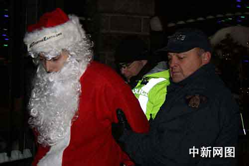 中新網渥太華12月13日電(韓瀟)12日晚,環保組織“為地球而戰”成員打扮成圣誕老人,提著代表工業污染的煤炭來到加拿大聯邦保守黨政府總理哈珀家“送禮”,以抗議加政府無視北極冰蓋融化,破壞巴厘島氣候變化會議的行為。警察戒嚴保護總理宅邸,與抗議者短暫接觸后,逮捕了部分“圣誕老人”。