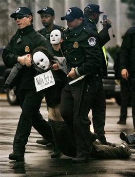 據香港《文匯報》報道,在美國國稅局大樓,100多名反戰人士企圖封鎖入口,其中數人甚至越過圍攔在門前靜坐。示威者稱,針對國稅局是因為它撥款資助伊戰,警方到場后拘捕了32人,并迅速清場。