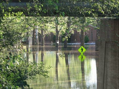 愛荷華市的洪水水位仍在上升,圖為該市大學(xué)藝術(shù)學(xué)院校園道路指示牌。