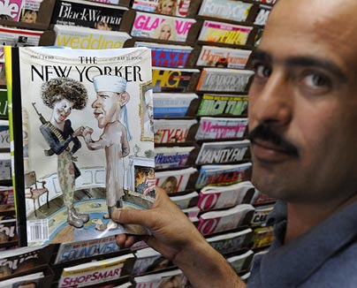 在本周《紐約客》封面上的這幅漫畫中,身穿穆斯林長袍的奧巴馬和打扮成恐怖分子的妻子在白宮的總統辦公室相互擊拳致意。總統辦公室的墻上掛著本拉登的畫像,壁爐里焚燒著美國國旗。