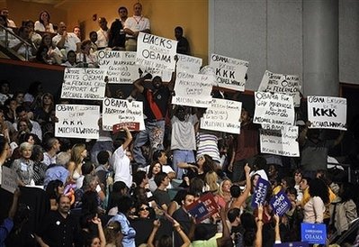 據(jù)“中央社”報道,希望成為史上首位非裔美國總統(tǒng)的奧巴馬19日在邁阿密大學(xué)的籃球館舉行造勢集會,正當(dāng)他在臺上發(fā)言時,觀眾席看臺角落出現(xiàn)抗議群眾,他們手持標(biāo)語,上頭寫道:“三K黨支持奧巴馬。”