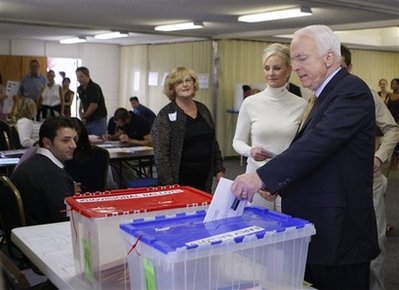 據報道,美國共和黨總統候選人麥凱恩4日在妻子辛迪的陪同下在亞利桑那州進行了投票。隨后麥凱恩計劃前往鄰近的科羅拉多州和新墨西哥州出席最后的競選拉票集會,當日下午再返回鳳凰城等候選舉計票結果。