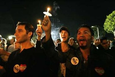 憤怒的人群擁堵在洛杉磯西好萊塢的同性戀聚集區,揮舞標語高喊口號,表達不滿。一位抗議者裸露的胸前寫著:我是八號提案的受害者!