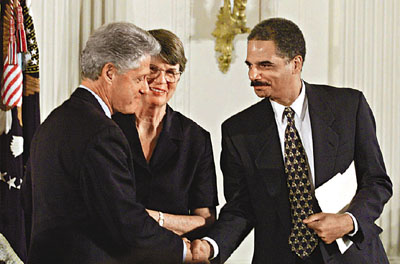 資料圖:霍爾德(右)曾在克林頓(左)政府時期,擔(dān)任司法部副部長。