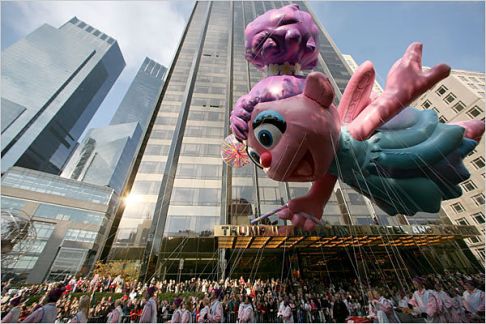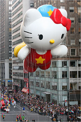 今年有11個(gè)大氣球加入游行,其中包括在天上飄的凱蒂貓(見圖),吸引現(xiàn)場(chǎng)所有人的目光,多達(dá)800名小丑和11支樂隊(duì),以及2000名拉拉隊(duì)員和舞者,將整個(gè)游行氣氛推向高潮。 一位紐約市民幽默的說(shuō):“我喜歡的是最后會(huì)出現(xiàn)的耶誕老人,因?yàn)檫@樣我們可以趕快離開,然后回家開始吃火雞!”