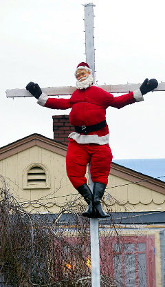 中新網(wǎng)12月24日電 美國(guó)華盛頓布萊摩頓居民康洛德最近對(duì)圣誕節(jié)彌漫的“消費(fèi)主義”十分反感,他的反感已經(jīng)不僅僅體現(xiàn)在避開購(gòu)物中心和關(guān)掉電視這么簡(jiǎn)單了,而是將圣誕老人釘在自家房前15英尺高的十字架上。