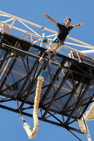 南非擁有世界上最高的蹦極點(diǎn),熱衷蹦極的人們常常在南非找刺激。近日,一位另類的蹦極手創(chuàng)下了蹦極運(yùn)動(dòng)的新紀(jì)錄:37歲的葡萄牙男子卡爾·迪奧尼西奧用1.85萬個(gè)安全套做成30米長(zhǎng)的彈性繩,代替?zhèn)鹘y(tǒng)尼龍繩跳下蹦極臺(tái),將“生死一線牽”的感覺發(fā)揮到極致。