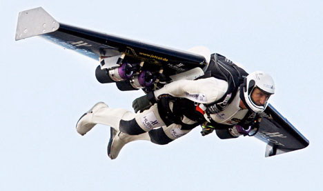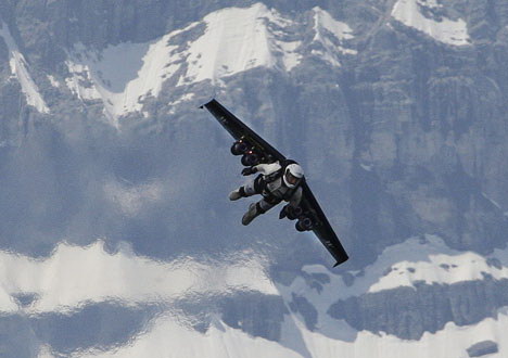 前瑞士戰(zhàn)斗機(jī)飛行員羅西花了五年的時(shí)間來建造和完善動(dòng)力翼套裝,他昨天穿著這套動(dòng)力翼套裝跳離了一架小型飛機(jī)。當(dāng)他從2250米的飛機(jī)上跳下時(shí),他展開了長達(dá)3米的動(dòng)力翼,動(dòng)力翼被綁在他的身后。當(dāng)從自由落體狀態(tài)轉(zhuǎn)為滑行狀態(tài)后,他啟動(dòng)了四個(gè)發(fā)動(dòng)機(jī),這使他的飛行速度加速至每小時(shí)304公里。他在爬升至780米后再次向地面俯沖,在身后留下一串特效煙霧。