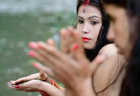 中新網9月5日電 綜合報道,9月4日是印度教傳統節日提吉節的最后一天。在尼泊爾加德滿都,印度教女子在河中沐浴,已婚的印度教婦女為自己的丈夫祈禱;未婚的少女們,則祈愿自己將來能找到一個英俊如意的丈夫。