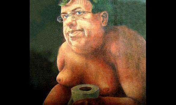 在愛爾蘭皇家海柏尼恩學(xué)院展出的畫中,考恩挺著圓鼓鼓的大肚子,左手拎著一條藍(lán)色內(nèi)褲。在愛爾蘭國家藝?yán)日钩龅漠嬛校级髀懵渡仙,左手攥著一卷衛(wèi)生紙,看起來正在蹲馬桶。兩幅畫展出不到20分鐘,立即引發(fā)轟動,有關(guān)部門勒令畫廊立即將畫作拿下。