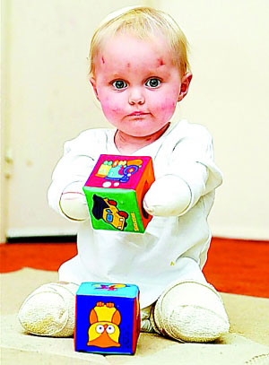 2005年,僅1歲多的小埃莉突患腦膜炎送進醫院,心跳一度暫停跳動,醫生甚至向她的父母宣布死亡。就在她的父母以為即將失去愛女時,小埃莉奇跡般地恢復心跳。然而發生奇跡的4天后,小埃莉的四肢逐漸壞死,醫生不得不切除她的四肢。埃莉的母親、現年35歲的麗莎回憶道:“當我見到她手術后的模樣時,我開始悲痛地尖叫起來。因為她只剩下了那么一點點。”讓人驚訝的是,埃莉的孿生姐姐蘇菲竟主動開始幫母親承擔起照顧妹妹的責任,給妹妹喂食,陪她玩耍,當起了“第二媽媽”。受蘇菲的鼓勵,小埃莉決定堅強面對身體的殘疾。小埃莉穿著假肢的照片轟動英國。