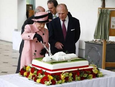5日女王和其丈夫到英國“巧園植物園”出席巧園成立250周年慶祝會。園方準備了一個長方形大蛋糕,下面是鮮花,上面是白色奶油。頂上做成巧園最有名的建筑,大溫室的樣子。蛋糕店老板把刀交給女王。女王一拿起刀,菲利普就在旁邊說,“好好切,用點力”。