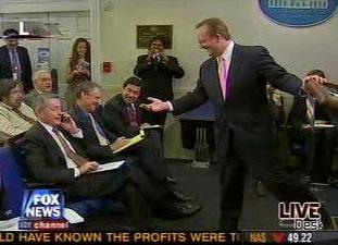 三家主要的有線電視臺都實況轉(zhuǎn)播了白宮新聞發(fā)布會。《人事》雜志記者約翰-吉茲的手機首先傳出鈴聲。吉布斯在聽到鈴聲后稱:“請放至震動,我們以前也是這樣作的。”當(dāng)手機再次發(fā)出聲音后,吉布斯走下講臺,要求吉茲交出手機,他隨后把手機扔給站在房間后面的一位助手。就在吉布斯回到講臺,開始回答一個問題時,美國哥倫比亞廣播公司記者比爾-普朗特的手機又響了起來。已負責(zé)報道白宮事務(wù)25年的普朗特拒絕了吉布斯交出手機的要求,他離開了房間,人們發(fā)出一陣笑聲,普朗特五分鐘后回到他的前排座位。