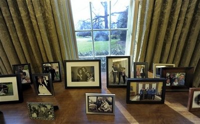 桌上的瓷器不見蹤影,代替的是歷史感強烈的美洲陶罐和器具;書架上出現的是馬丁•路德金在1963年華盛頓游行時發(fā)表的著名演說“我有一個夢的”的照片;而在總統辦公桌后面的桌上則擺滿了奧巴馬和家人的照片。