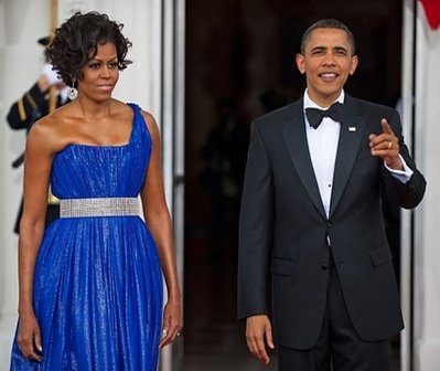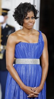 當晚,奧巴馬夫人米歇爾再次閃亮登場,其著裝打扮又被眾媒體拿來評點一番。米歇爾穿了亮藍色單肩拖地長裙,腰間系上銀色腰帶,并佩戴了銀色耳環。
