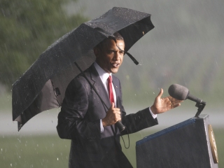 5月31日下午,奧巴馬準備在林肯國家公墓發(fā)表國殤日演說,正當他站上講臺之際,天空中忽然下起大雨,一時間雷電交加,風(fēng)也狂吹,一旁的旗幟不停左右搖擺。由于雷雨越下越大,完全沒有趨緩,奧巴馬撐著一把大黑傘,宣布演說暫時取消。