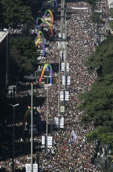 中新網6月7日電 據外電報道,巴西城市圣保羅周日(6日)舉行一年一度的同性戀大游行,組織者稱這是世界上規模最大的此類游行。