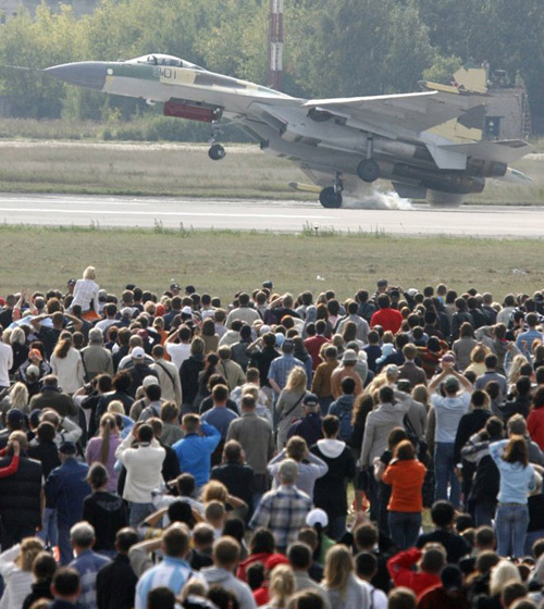 圖片是8月22日周六在航展上蘇-35飛行資料圖。有參觀者還誤以為是俄新式戰機在進行特技表演。照片清楚顯示,飛機降落時發生傾斜,靠右側起落架落地。駕駛該飛機的是第一個(2008年2月)駕駛蘇-35的飛行員謝爾蓋•伯格達。(梁小逸)