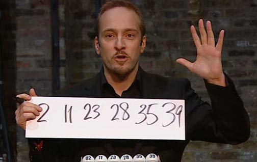 英國(guó)電視臺(tái)現(xiàn)場(chǎng)直播了當(dāng)期彩票的開(kāi)獎(jiǎng)過(guò)程,由機(jī)器隨機(jī)選擇箱子中的球。而在另一個(gè)演播室,放置了一臺(tái)電視播放開(kāi)獎(jiǎng)過(guò)程。這位身處另一演播室的神秘“幻術(shù)師”在結(jié)果出來(lái)之前,就背對(duì)電視寫(xiě)下了一組數(shù)字,分別是2、11、23、28、35和39。結(jié)果證實(shí),他所預(yù)測(cè)的數(shù)字與中獎(jiǎng)結(jié)果完全一致,令人瞠目結(jié)舌。