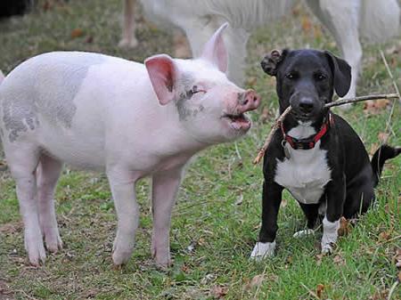 據臺灣東森新聞網報道,英國一動物庇護站人員表示,小豬剛被收養時,因為容易生病,所以就把它放養在房子周圍,以方便觀察病情。沒想到它很快就與周圍的小狗打成一片。小豬剛進來的時候體型只有小狗的一半,5周后就比小狗大上了2倍。