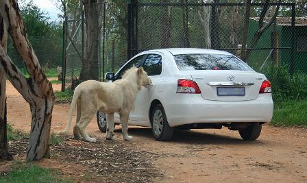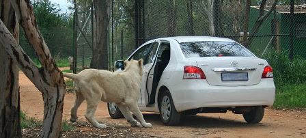 據報道,在南非約翰內斯堡野生獅子動物園,一輛白色豐田車的車主粗心大意,沒有按照園方叮囑鎖好車門,結果真的讓一頭獅子“盯上”了。這只重約136公斤的獅子走近汽車,用嘴來回摸索,竟然用牙齒咬住了車門的把手,將車輛左后方的車門拉開了。而車主尚在車內,被嚇得一動也不敢動,完全驚呆了,像是難以置信。