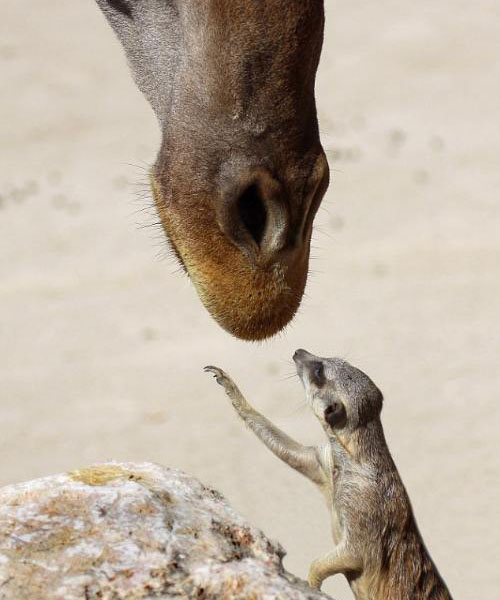 報道稱,40歲的阿方索說,他看到兩只狐獴從住處溜了出來,一路往長頸鹿的圍欄方向玩耍,最后終于溜了進去,當其中一只狐獴站在兩塊石頭中間,一只小長頸鹿湊了過來。