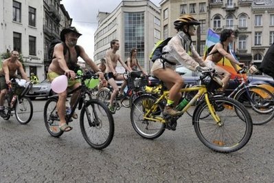 中新網6月20日電 據外電報道,19日,數十名比利時人赤身裸體,迎著風雨上街騎自行車,抗議布魯塞爾市內汽車太多,占用公共空間。