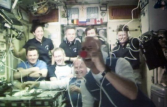 此次在國際空間站逗留、觀光期間,拉利伯特干起雜技演員老本行,戴上小丑鼻子道具,在零重力狀態下與自己的孩子們進行視頻通話。此外,他還完成了一項特殊使命──在國際空間站與地面舉行了“地空聯機”,呼吁公眾關注水資源問題。