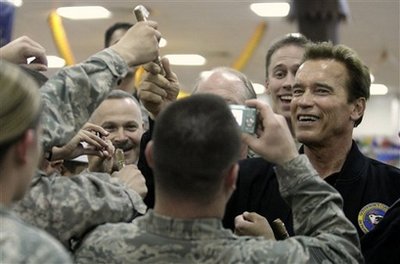 16日,美國加州州長施瓦辛格來到位于伊拉克首都巴格達郊區勝利營一個熱鬧的餐廳,與在餐廳的駐伊美軍士兵們見面。他對軍隊的工作表示祝賀,感謝士兵及其家人做出的犧牲,并與士兵握手、擺姿勢拍照。施瓦辛格還叮囑士兵們健身鍛煉的必要性,表示“每天都要(為自己)打氣”。