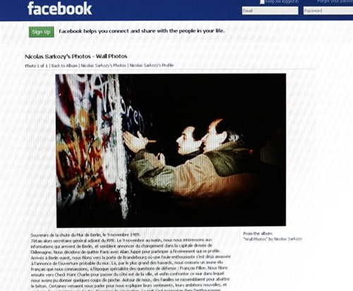 前幾天,薩科齊在社交網站facebook上發布了一張舊照片,顯示他正在鑿柏林墻,聲稱自己于1989年11月9日用鐵鎬見證了柏林墻的倒塌。