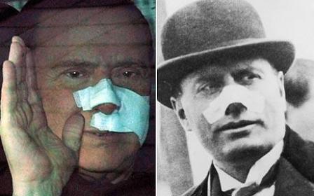 出院時(shí),只見貝氏鼻子和左臉都包著白紗布,有人指出他的這一形象與80多年前,意大利法西斯獨(dú)裁頭子墨索里尼遇襲的形象十分相似。據(jù)悉,1926年,一名憤怒的愛爾蘭貴族在一次會(huì)議上槍擊了墨索里尼,子彈恰恰擦中了墨索里尼的鼻子。與貝盧斯科尼一樣,墨索里尼當(dāng)年遇襲時(shí)同樣是意大利總理、同樣是臉部受傷,照片顯示二人連包扎傷口的位置都幾乎相同,不禁讓人感嘆歷史奇妙的巧合。