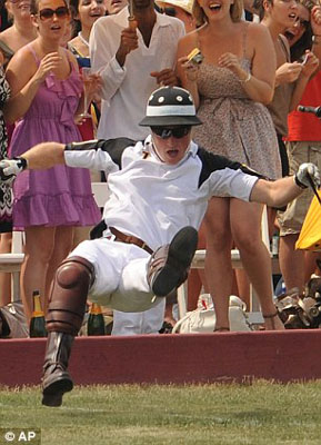 美國當地時間27日,哈里王子來到紐約總督島參加慈善馬球比賽,為非洲貧困國家的艾滋病孤兒們籌集資金。當地居民本想一睹英國王子的賽馬英姿卻額外收獲了王子落馬時的窘相。哈里王子跌落后又在地上翻了幾個跟頭,然后迅速起身,看起來身體并無大礙。但他面露羞澀,對這一跤頗感尷尬。