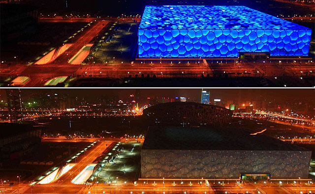 2009年3月28日,“水立方”燈光逐漸熄滅的過程。