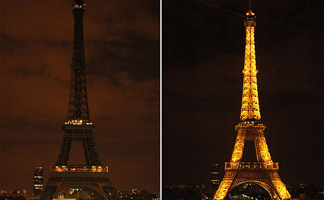 2009年3月28日,法國巴黎埃菲爾鐵塔熄燈后和亮燈后的照片。