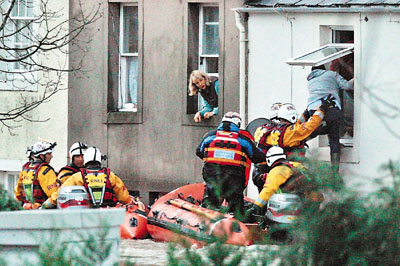 千年一遇洪水襲英倫 受困災民爬上屋頂躲避(圖)