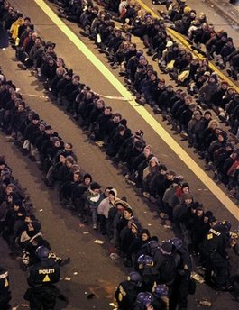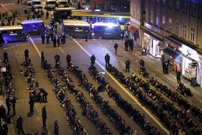 近日來,在哥本哈根舉行的示威活動大部分是和平的,但是在當天的集會中,有數百名身穿黑衣的年輕人在街上投磚頭,砸窗戶,警方對此進行了干預。防暴警察包圍了鬧事者,要求他們坐在地上,把手放在身后,然后被集體押上警車。