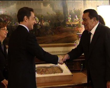 據報道,14日,薩科齊在巴黎會見了前來訪問的穆巴拉克,雙方在總統府愛麗舍宮享用正式午餐后, 薩科齊交還給穆巴拉克一件埃及文物——法老時期裝飾石碑的殘件之一。