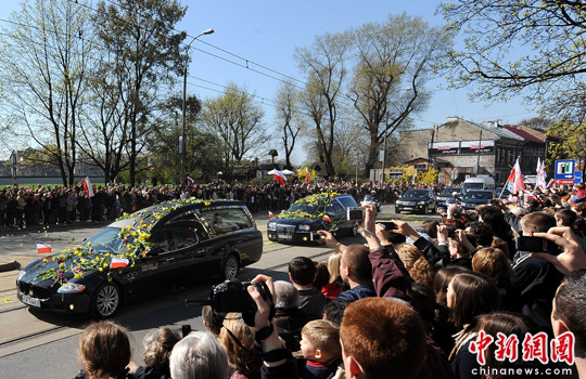 卡欽斯基夫婦的遺體昨日早上從首都華沙,運(yùn)抵克拉科夫,當(dāng)靈車緩慢駛過時(shí),道路兩旁的民眾獻(xiàn)上鮮花致敬。于當(dāng)?shù)貢r(shí)間下午2時(shí),在汽笛和教堂鐘聲之下,圣母大教堂的葬禮正式展開,在教堂外,數(shù)以萬(wàn)計(jì)的波蘭人民聚集,透過大銀幕上的直播參與葬禮。其后,卡欽斯基夫婦的棺木被運(yùn)往瓦維爾宮,接受21響禮炮致敬和安葬,與多位帝王英雄同葬一地。