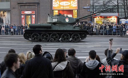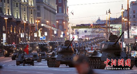 據報道,27日,俄羅斯出動約159輛軍用車輛及1萬多名軍人,進行了關于今年5月9日俄羅斯衛國戰爭“勝利日”65周年時,紅場閱兵儀式的彩排活動。此次閱兵分為兩部分:歷史部分和現代部分。歷史部分由身穿衛國戰爭時期軍服的士兵游行,同時還會有9輛T-34坦克和8輛SU-100自行火炮進行在游行隊伍當中。現代部分則由13輛老虎裝甲車、BTR-80裝甲車、BMP-3步兵戰車、T-90A坦克和S-400防空系統等組成。